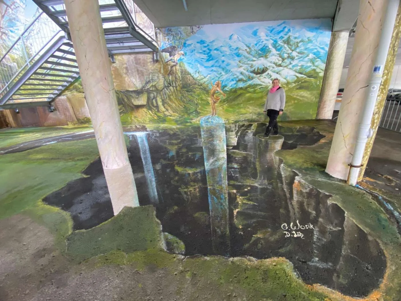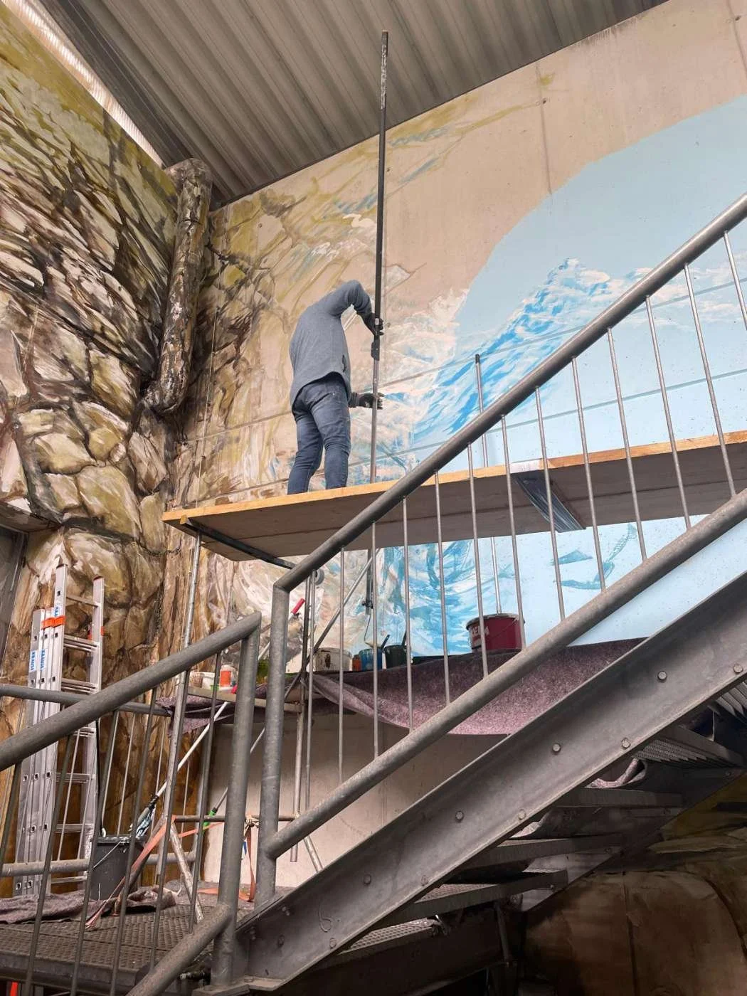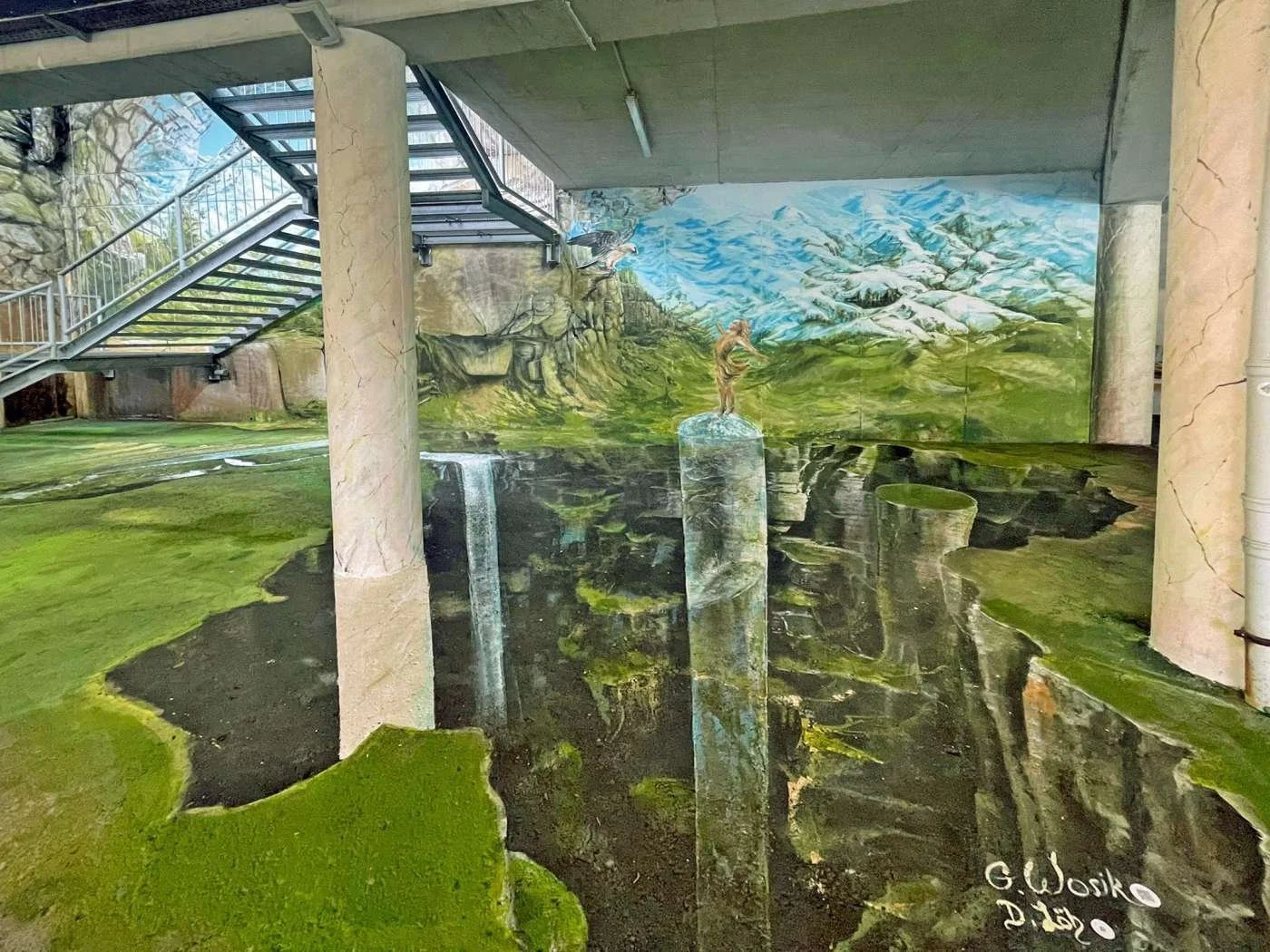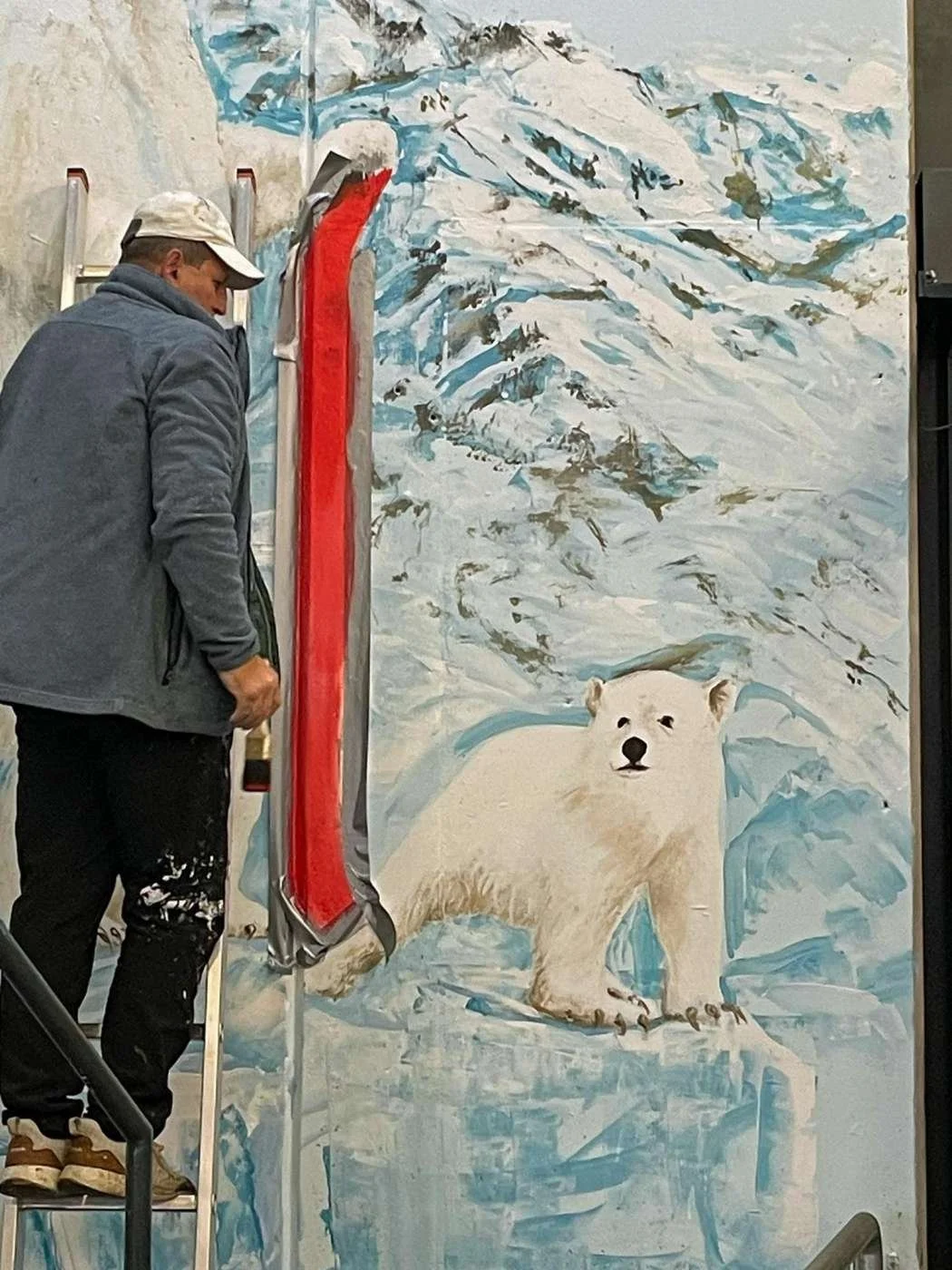 Ein besonderes Highlight ist die eindrucksvolle 3D-Malerei, die eine illusionäre Tiefe erzeugt und den Raum scheinbar öffnet. Besucherinnen und Besucher werden Teil des Kunstwerks: Zwei Fußabdrücke am Boden markieren den perfekten Standpunkt für einzigartige Fotos, bei denen man selbst mitten in der alpinen Szenerie zu stehen scheint. Das Erlebnis wird durch das charmante Maskottchen des Mölltaler Gletschers, den Möllibären mit seinen zwei Babys und einem Skateboard, ergänzt. Er begrüßt die Gäste am Aufgang zur Stollenbahn und lädt besonders Familien zu einem fröhlichen Fotoshooting ein. Ein weiteres faszinierendes Detail ist die außergewöhnliche Maltechnik von Gregor Wosik, der große Bildflächen mit einer Malerrolle auf einer Teleskopstange gestaltete. In spontaner, freier Arbeitsweise entstand so ein lebendiges 3D-Bild, das Präzision, Dynamik und künstlerische Intuition vereint. Wir laden herzlich ein, dieses einzigartige Kunstwerk am Mölltaler Gletscher zu entdecken. Erlebt die eindrucksvolle Verschmelzung von Kunst, Natur und alpiner Geschichte und nehmt unvergessliche Erinnerungsfotos mit nach Hause. Lasst euch von der Magie dieses besonderen Ortes verzaubern – und werdet selbst Teil eines außergewöhnlichen Kunstwerks.