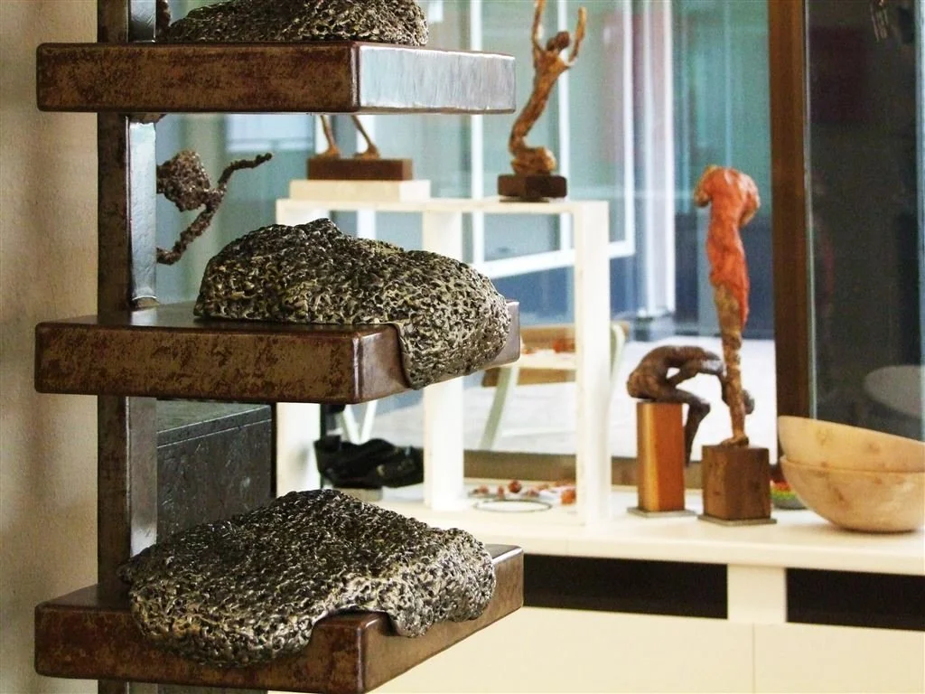 Seine Inspiration holt er sich hauptsächlich aus der Natur und lässt diese einzigartige Symbiose von Holz, Stein und Stahl zu kreativen Kunstwerken entstehen.