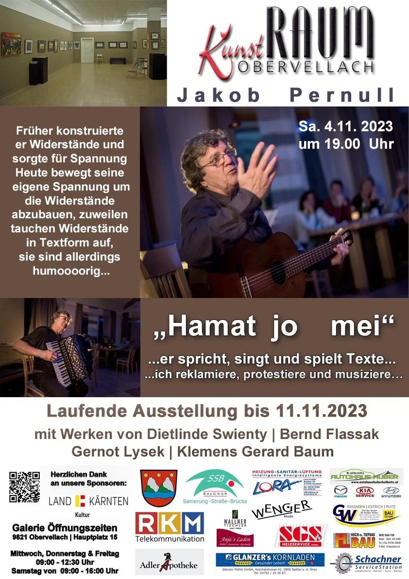 Beim Kabarettabend unter dem Titel „Hamat jo mei“ am Samstag den 4.11.2023 im KunstRaum Obervellach durfte Kunstraum Präsident Maximilian Lesnik den Kabarettisten Jakob Pernull aus Tröpolach begrüßen ! Jakob Pernull begeisterte die Besucher mit Liedern am Akkordeon und Gitarre sowie seinen Texten mit teils humoriger Reflektion unserer bisherigen Lebensweise; er plädiert aber auch für mehr Achtsamkeit und Schutz des Menschen und die Natur. In manchen Passagen zeigt er die Finsternis sowohl in der Natur wie auch im Herzen des einzelnen von uns Menschen auf. Es geht um Besitz und Begehren, manchmal sogar ohne Rücksicht auf’s Leben. Jakob proklamiert dieser jetzigen Welt nicht zu nahe zu kommen, denn die Begehrlichkeiten lauern überall. Um ein lebenswerteres Morgen zu wecken braucht es mehr Achtsamkeit und menschliche Verbundenheit.